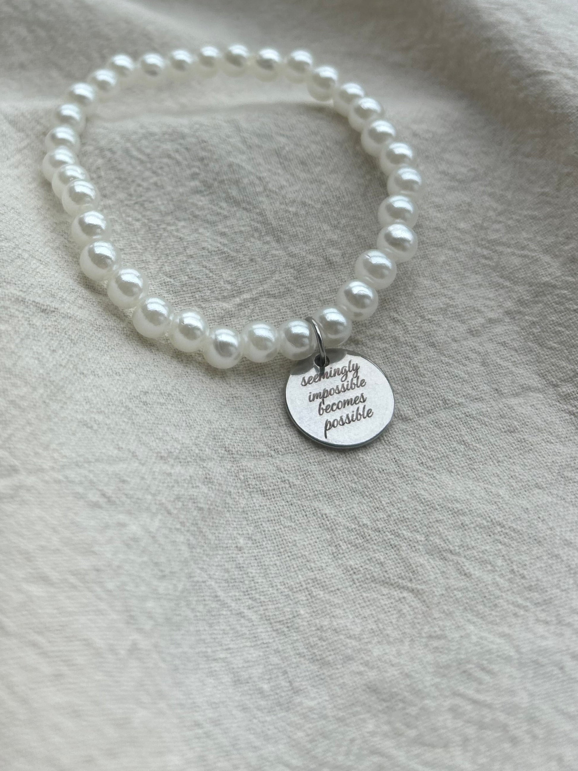 Faux pearl bracelet inspired by the Artemis 2 mission. Words from Christina Koch.